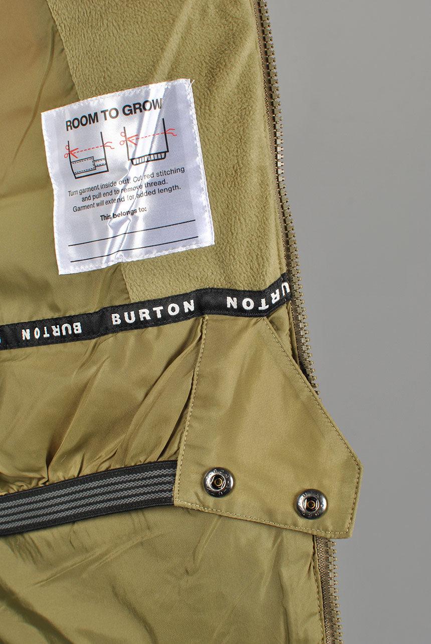 Room-to-Grow system extends the length of the sleeves by 1.5in to keep up with growth spurts; Ergonomic water-repellent waist gaiter with jacket-to-pant interface; Drop hem for extended length and added coverage; Glove loops; Ticket O-ring; Adjustable cuffs