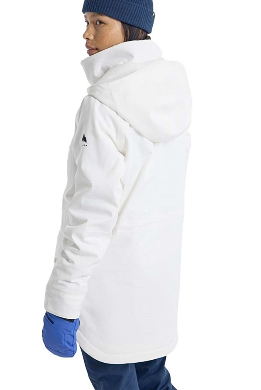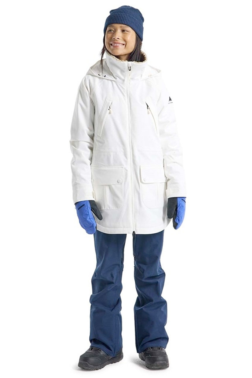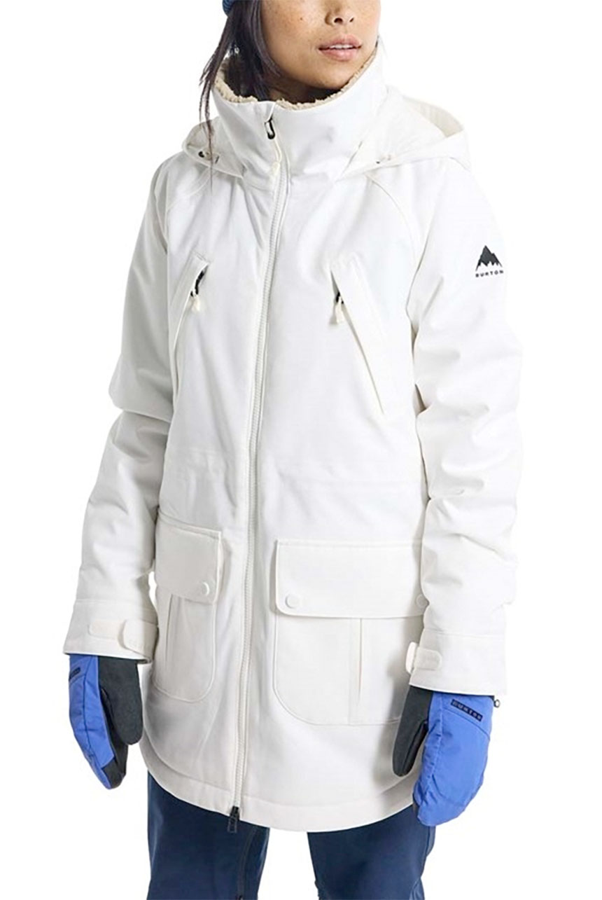 The women's Burton Prowess Jacket marries fashion-forward fabrics and design with rider-driven features to create a jacket that's easy on the eyes – on-hill or around town. An exaggerated drop tail adds style and seals out cold, while waterproof/breathable DRYRIDE fabric outperforms everything in your closet. Recycled content ThermacoreECO insulation with the added cush of sherpa fleece inside the collar will have you wrapped in warmth. The super-breathable pores of our Living Lining® shrink or expand to retain or release heat like automatic climate control.