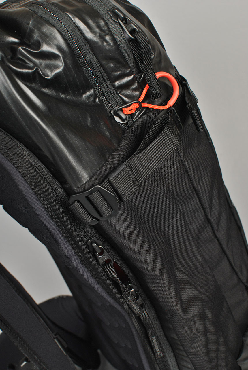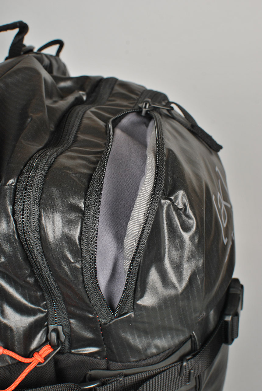 Behind it's minimalist exterior is a pack loaded with useful stuff for the backcountry like a snow-shedding back panel, a fleece-lined goggle pocket, a helmet sling, ice axe loops, and radio-compatible shoulder straps.