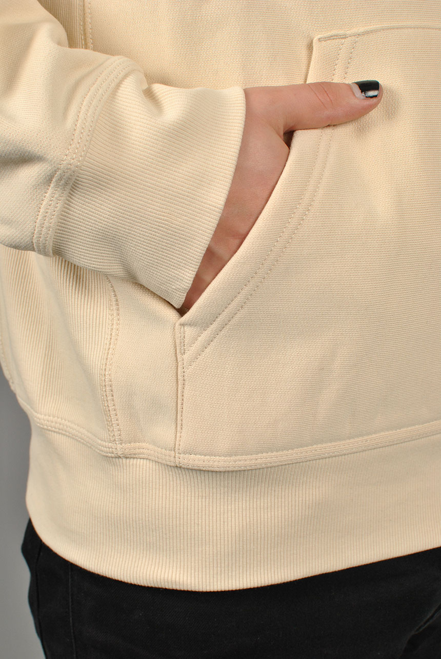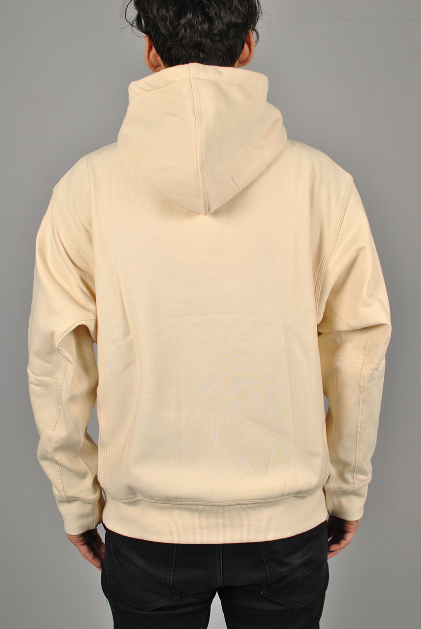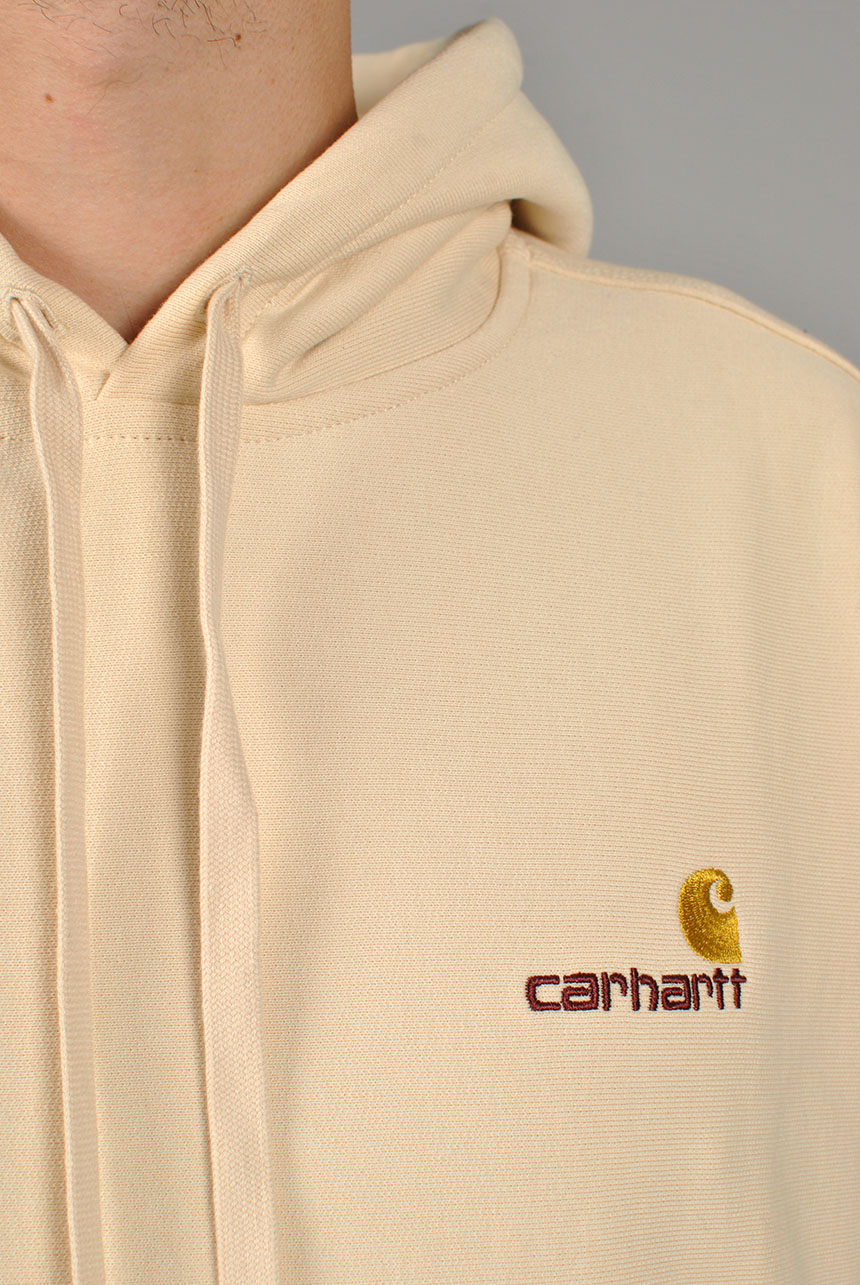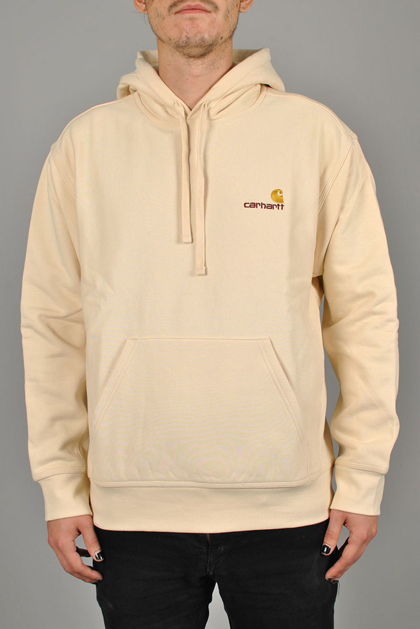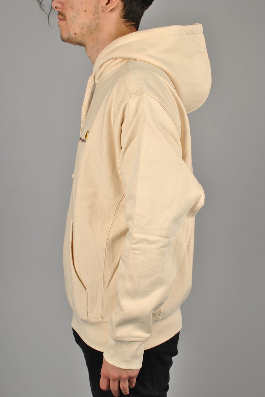 Made from heavyweight, cotton-poly jersey fabric, the Hooded American Script Sweatshirt has been brushed to give it a fleece-like backing. The garment has a loose fit, and is detailed with contrasting ribbed side panels, and American Script embroidery at the chest.