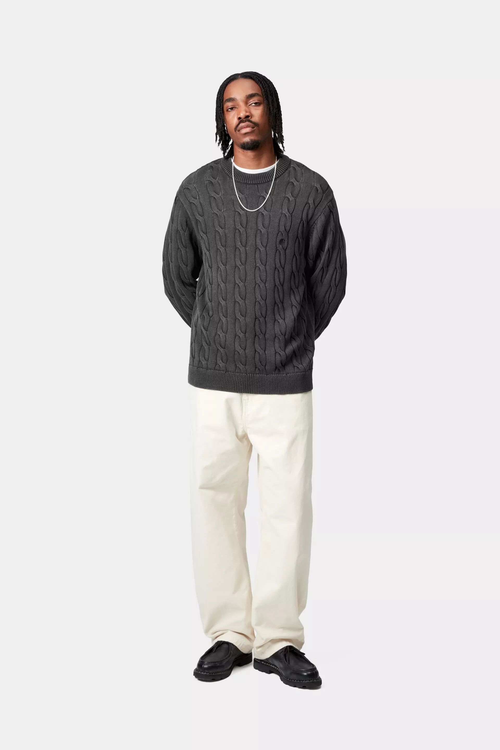 The Carter Sweater is a midweight, cable-knit style made from cotton yarn. An embroidered 'C' Logo appears on the chest.