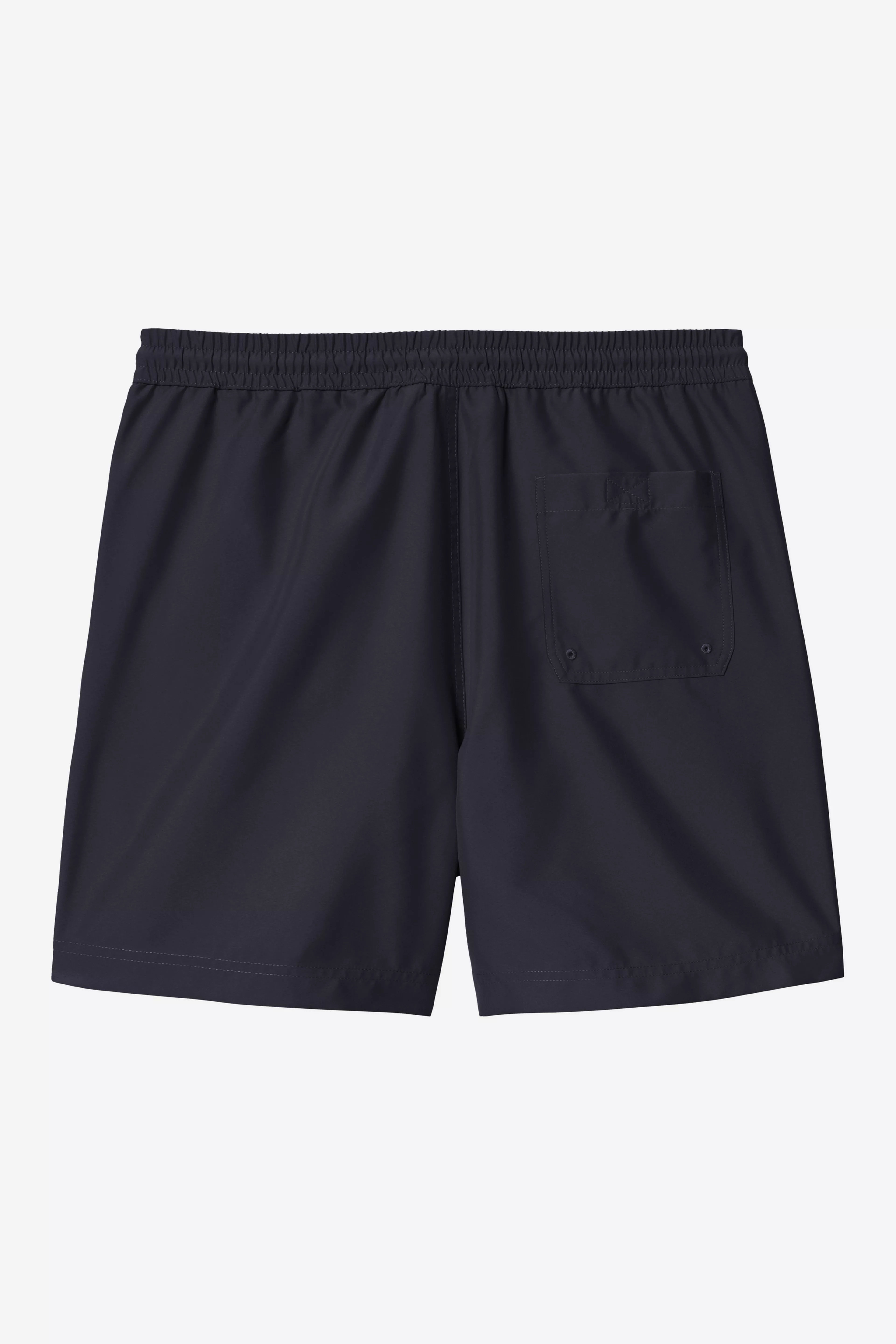 The Chase Swim Trunks are constructed from lightweight polyester fabric with water-repellent, fast-drying qualities. They also feature an inner mesh lining. The trunks have two side seam pockets, as well as a back pocket with a key holder. An embroidered 'C' Logo appears on the left leg.