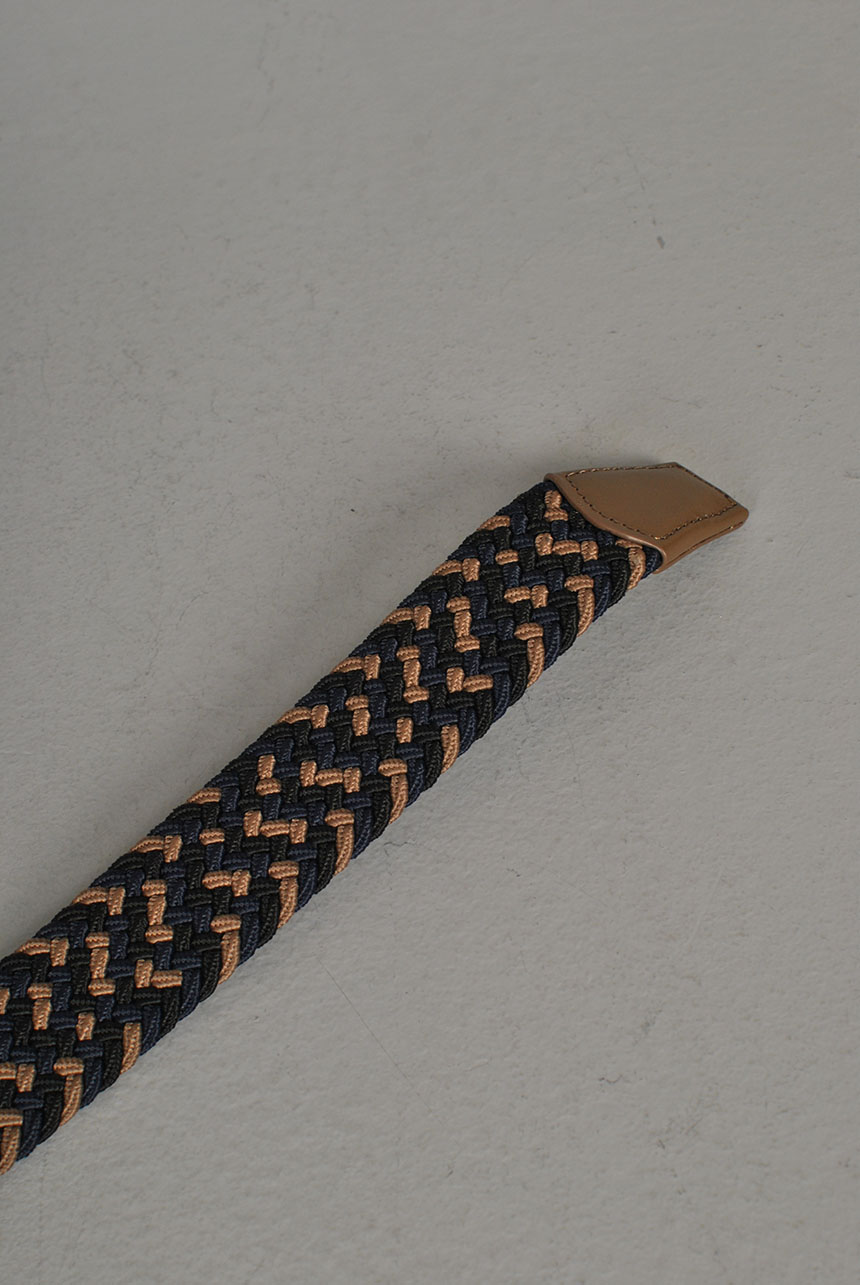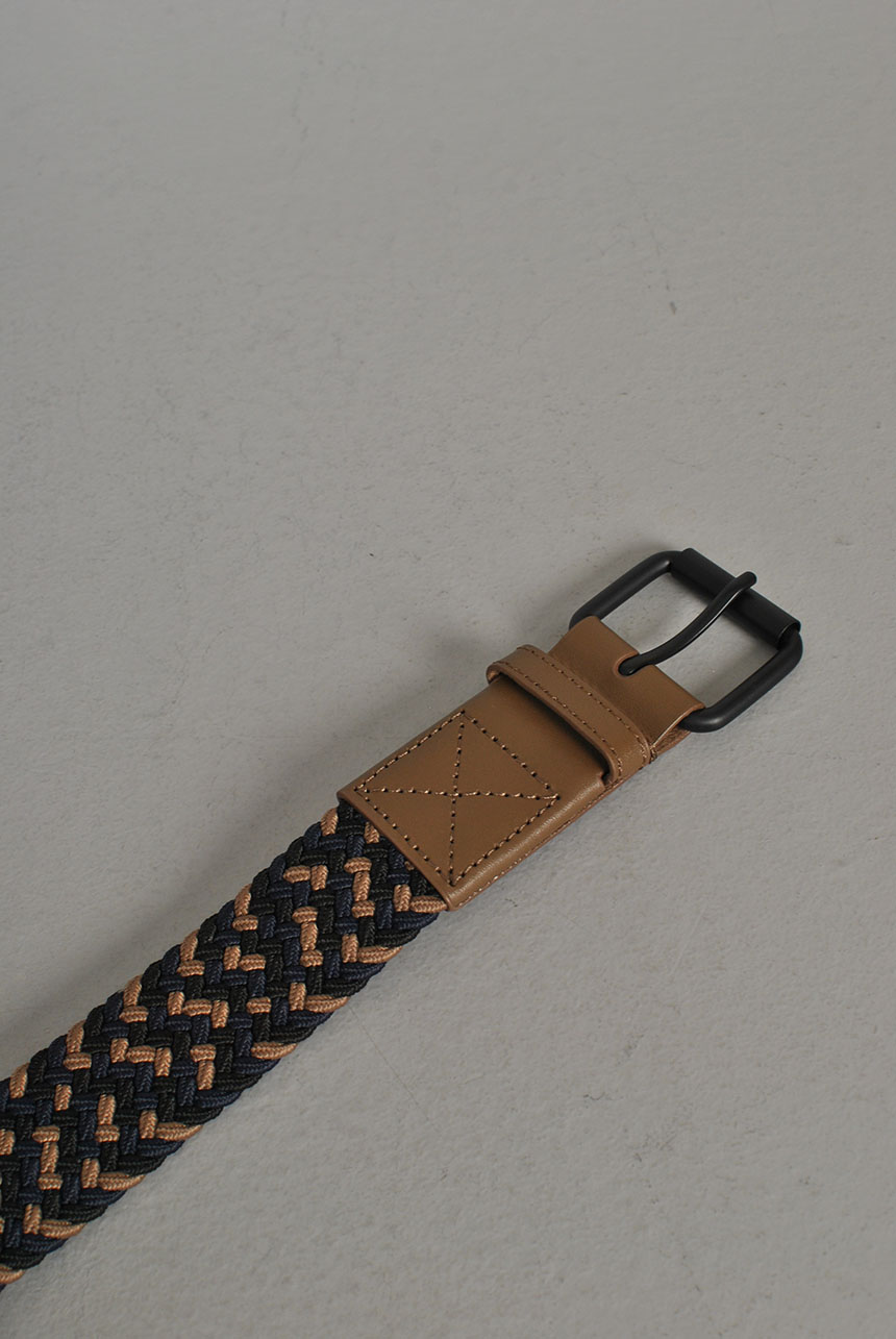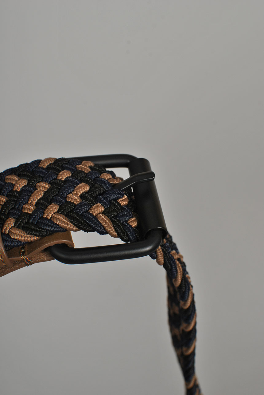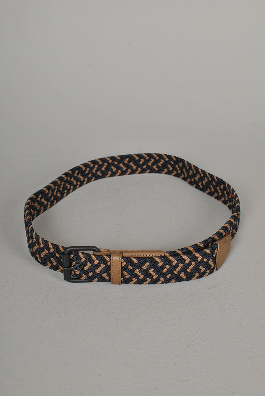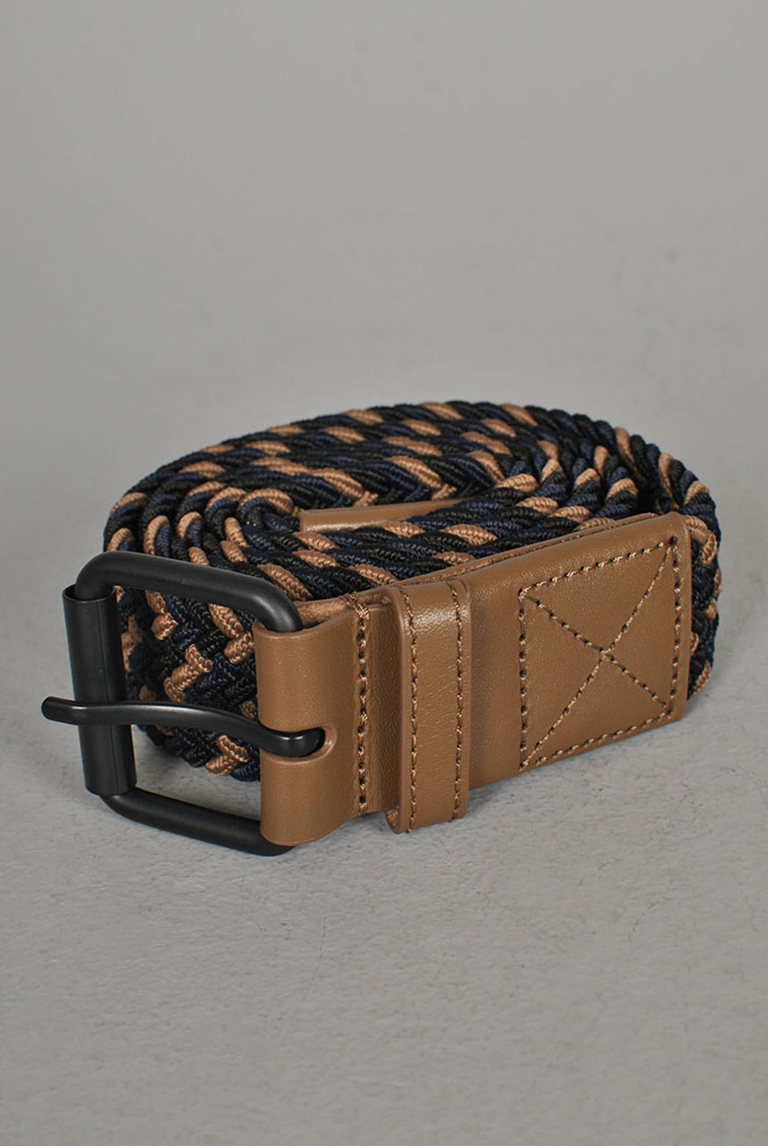 The Jackson Belt is woven from flexible polyester cording. It features a metal buckle and leather detailing.