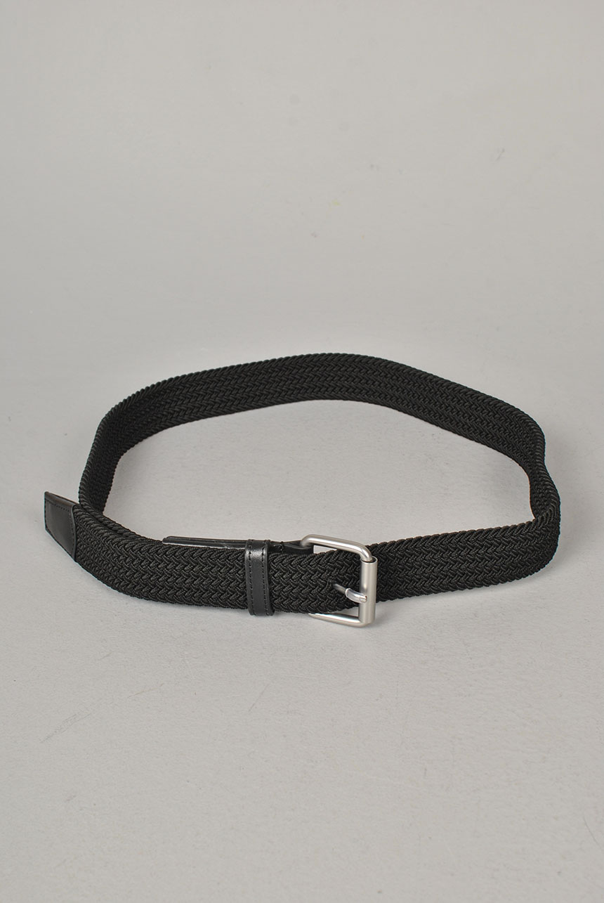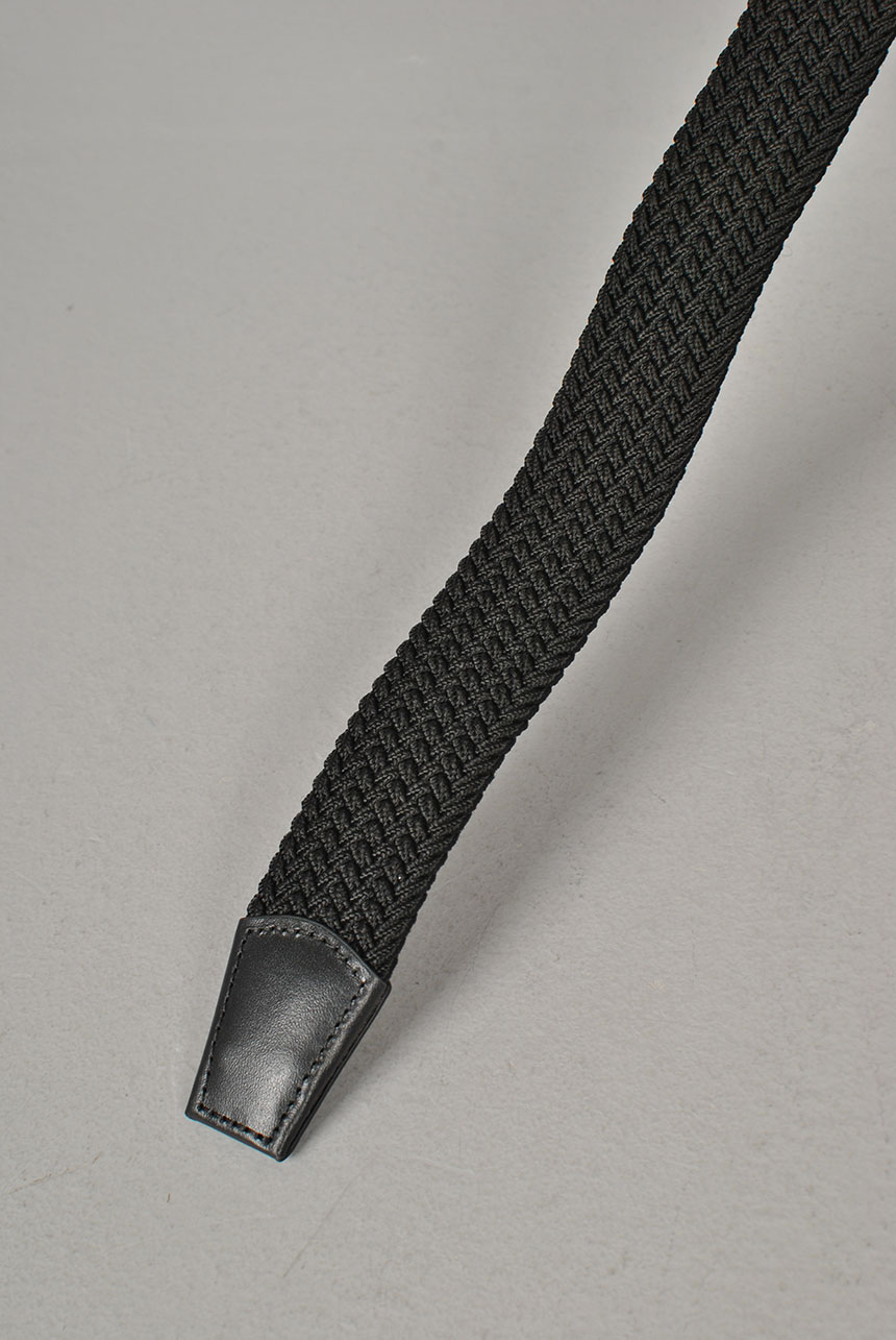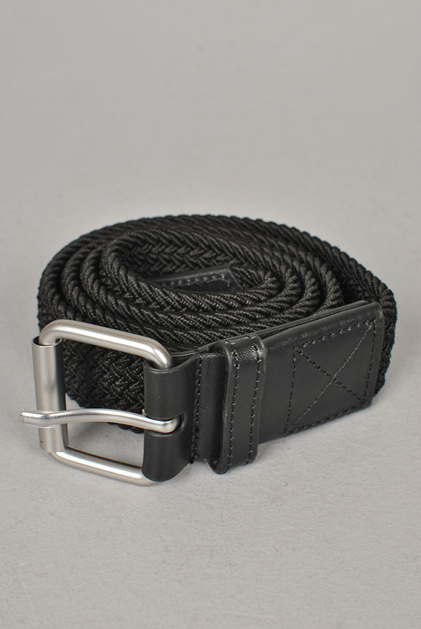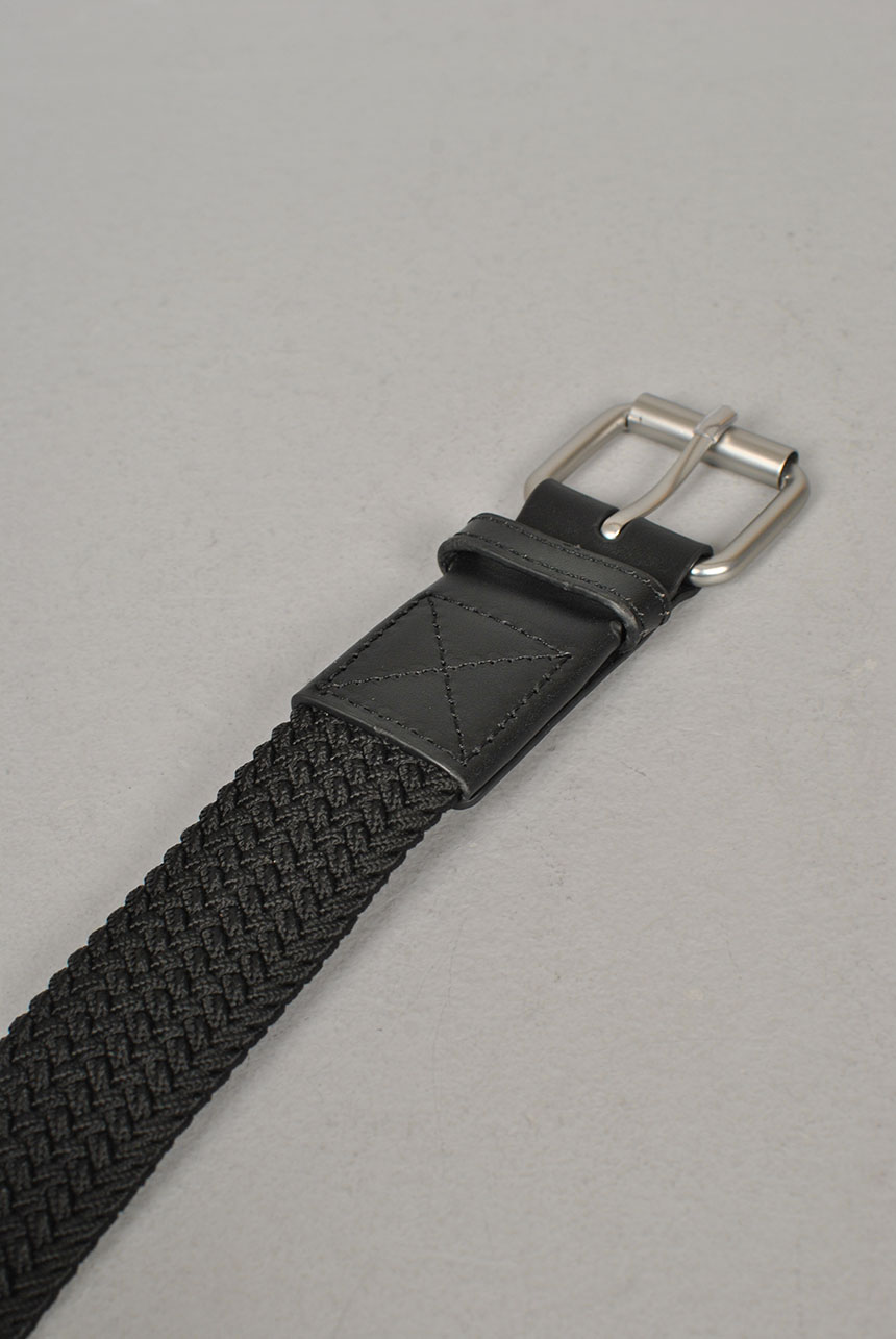 The Jackson Belt is woven from flexible polyester cording. It features a metal buckle and leather detailing.