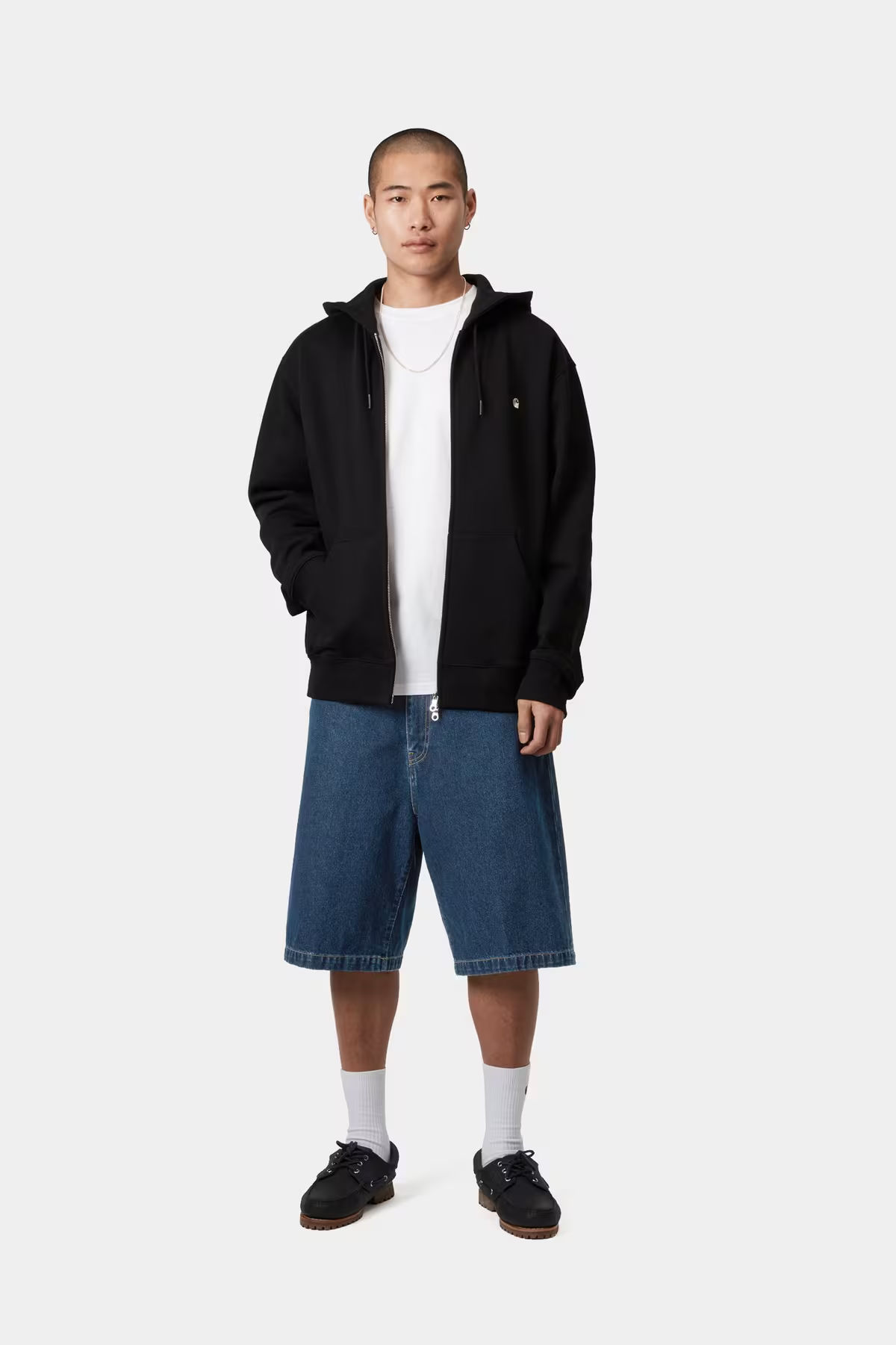 The Landon Short is constructed from a heavyweight denim that has been stone washed for a softer feel. The item features a regular waist and a back yoke, giving it a construction similar to a classic five pocket jean. The garment is finished with contrast stitching and a woven Square Label on the rear. Loose fit.