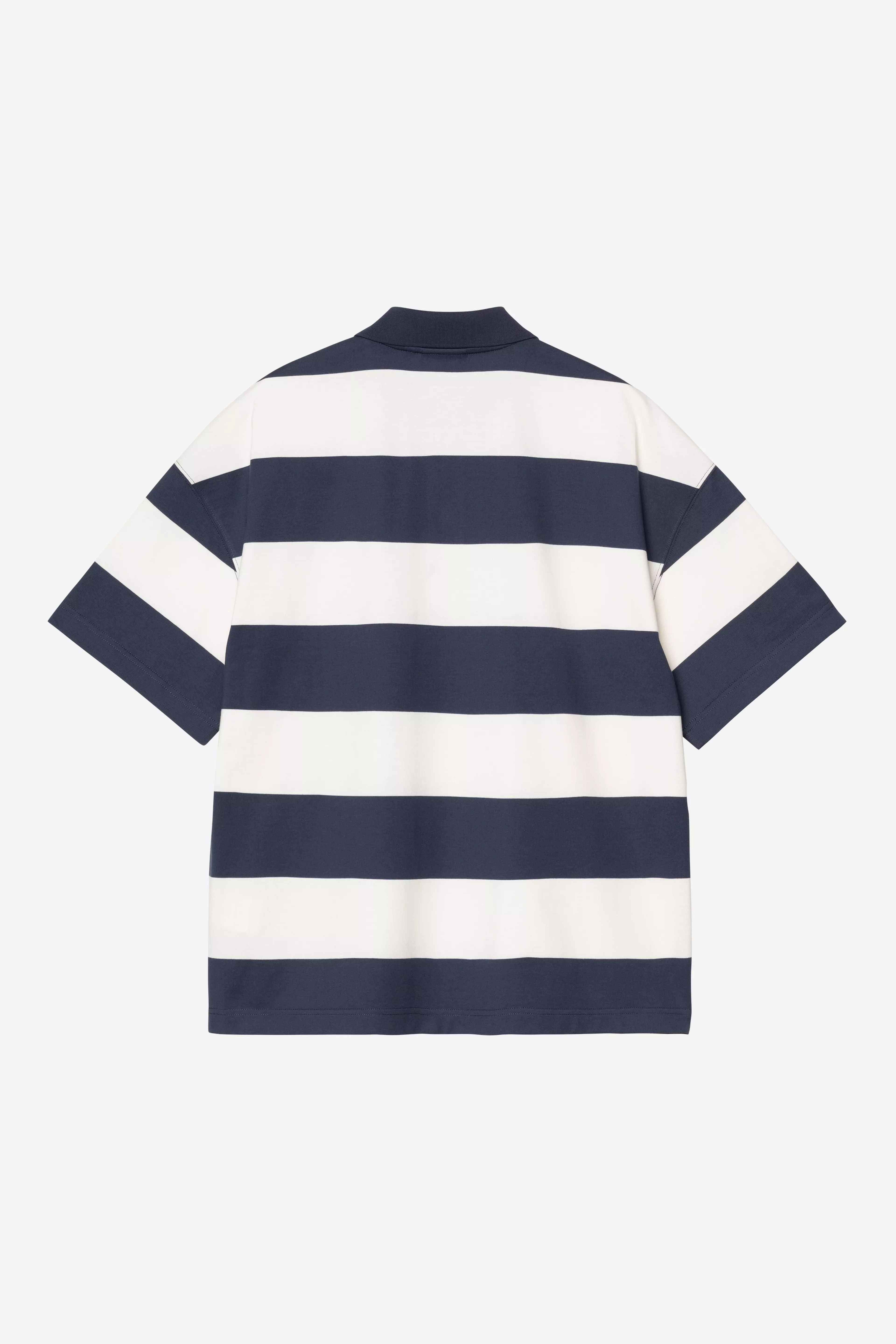 The S/S Delray Polo is made in a boxy loose fit from a midweight organic cotton jersey featuring allover stripes. The item has a collar and a buttoned half-placket. Graphic embroidery appears on the chest.