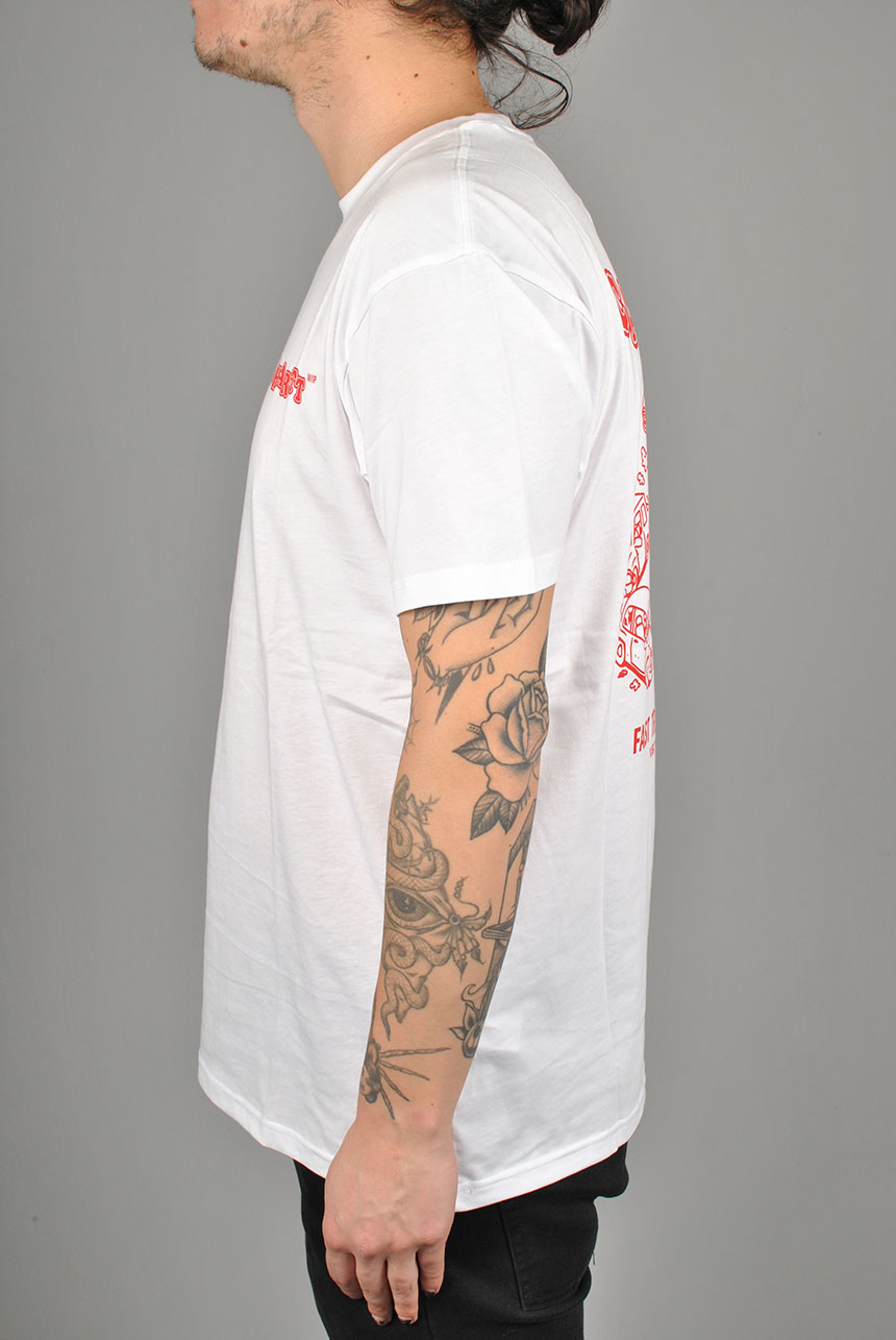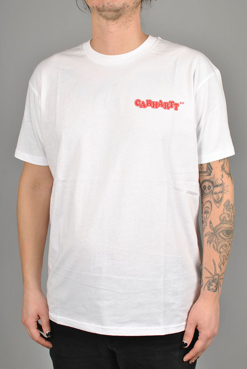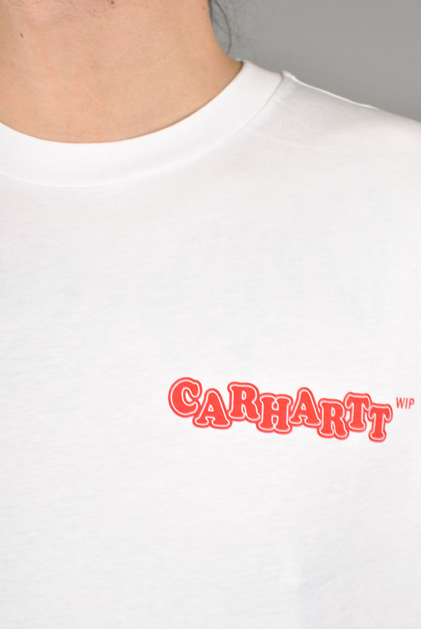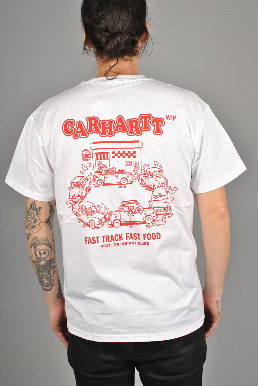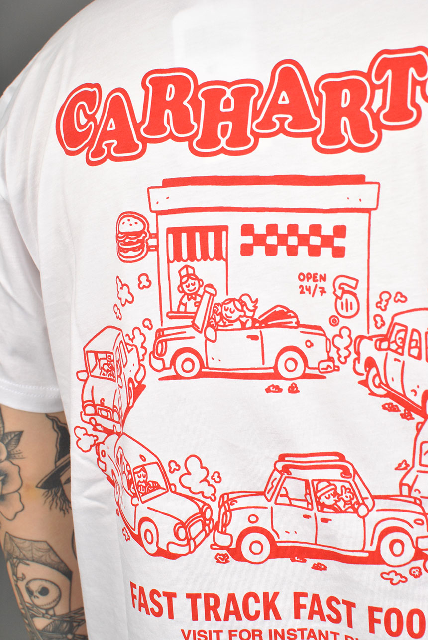 The S/S Fast Food T-Shirt is woven from lightweight organic cotton jersey in a loose fit. Graphic prints appear on the chest and back.