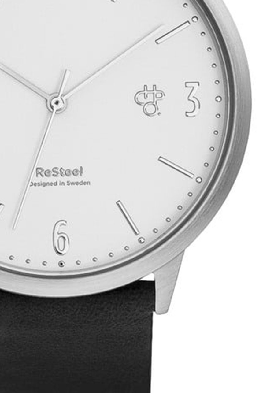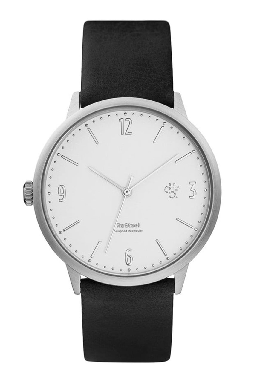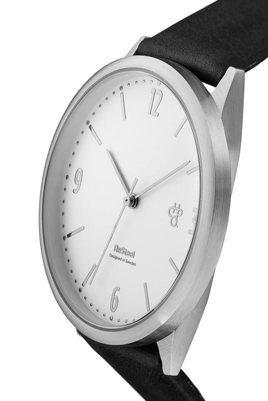 00% recycled stainless steel. Named Wednesday as an homage to the great steel city of Sheffield! Comes with a 40mm silver dial and a black vegan leather strap.