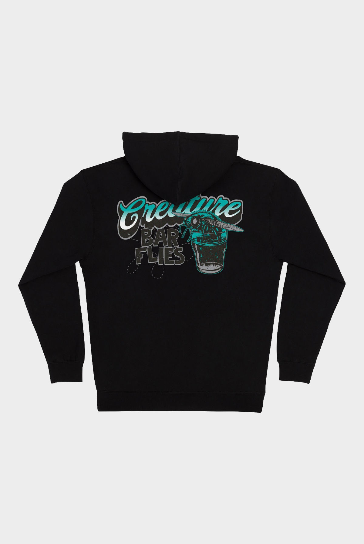 The Creature Barfly men's regular fit, heavyweight fleece, zip hooded sweatshirt features small front and large back Creature Barfly artwork printed in soft hand ink.