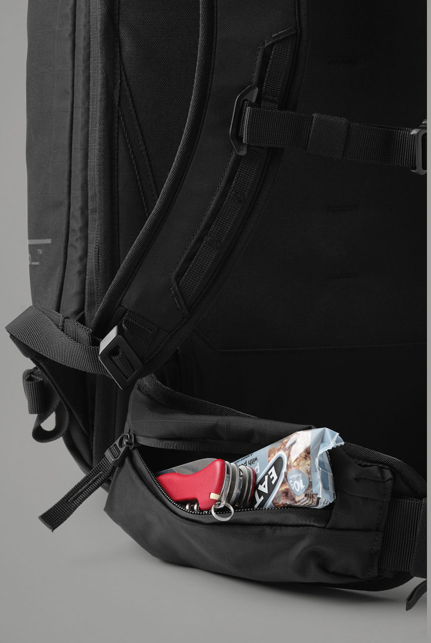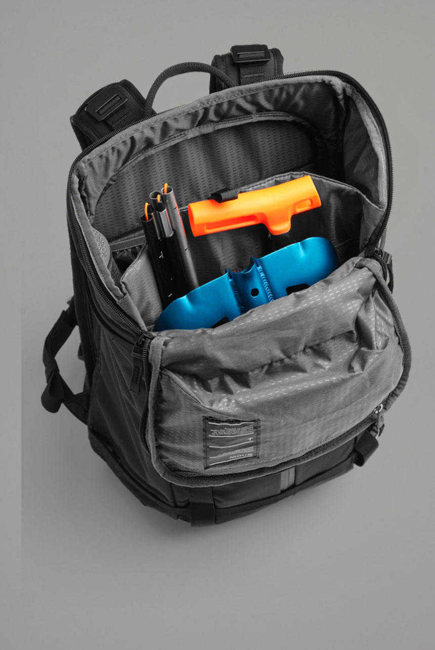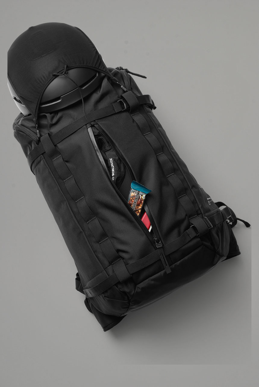 The off-piste pack for life on and off the mountain. Developed with a recycled high-tenacityc black Nylon yarn, this lightweight fabric is constructed with a mega ripstop blending outdoor heritage and modernity for superior durability for its weight class.