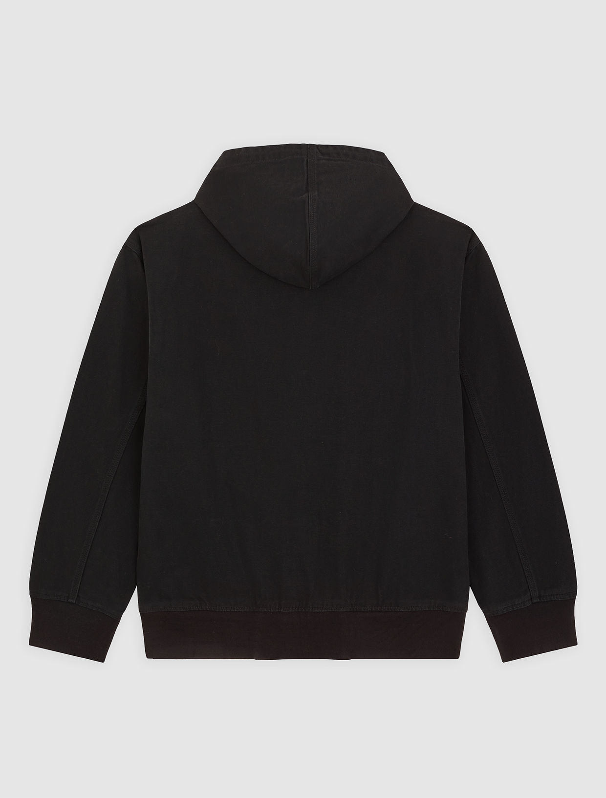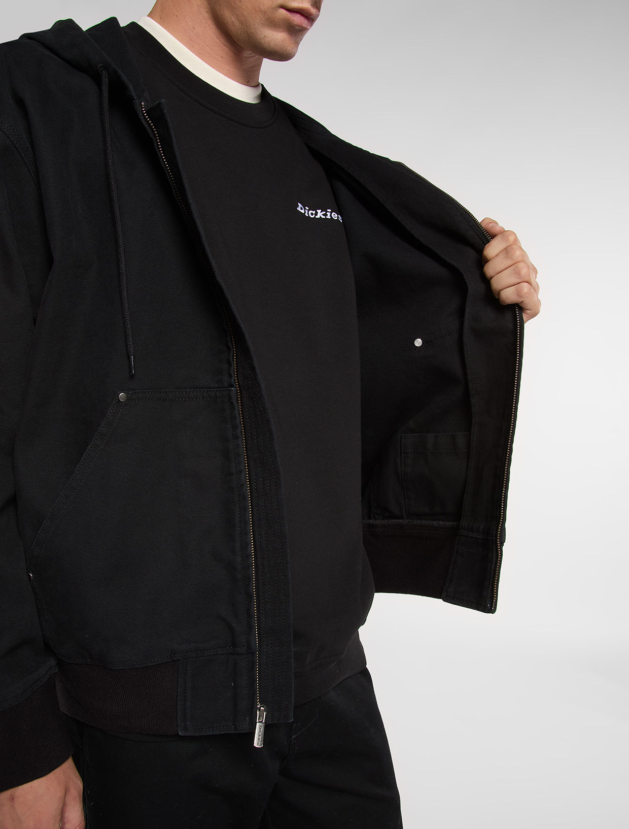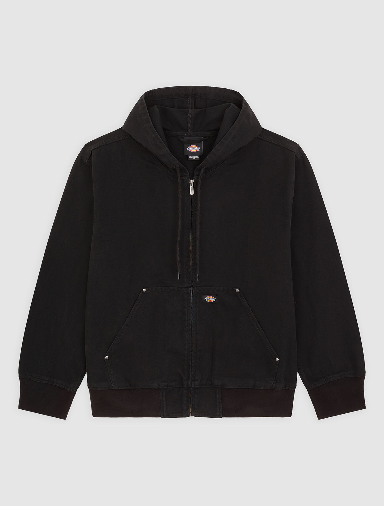 Styled for a laidback look, our hooded jacket features an understated silhouette built from our classic workwear duck canvas. With a regular fit, adjustable hood and stonewashed finish for softness, it's the perfect style for tricky in-between days when it's not quite warm enough for a hoodie or sweat. Stash essentials in the side-entry pouch pockets and show off the subtle Dickies woven label with pride.