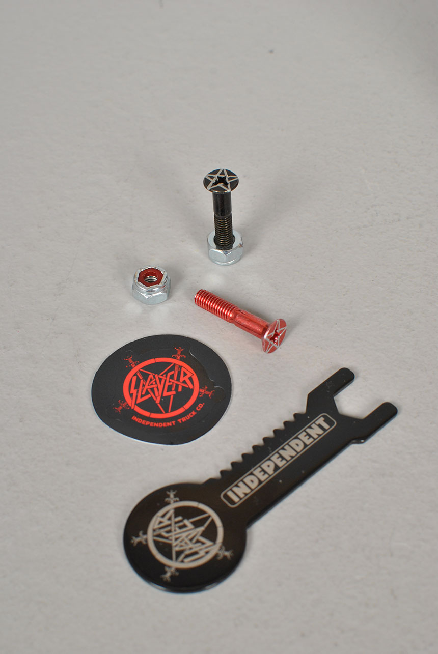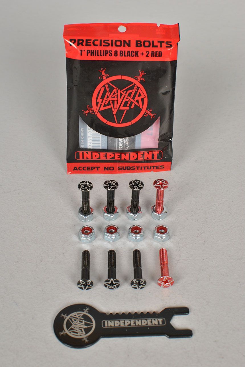The Independent x Slayer Phillips Hardware is part of a new collaboration between Indy and Slayer. This set of hardware brings you 8 black bolts and 2 red ones with 8 silver nuts for a quality setup that'll keep you screwed in tight. Includes 2 extra black bolts as well as a miniature pocket sized tool for desperate times on the go. Sold as a full set.