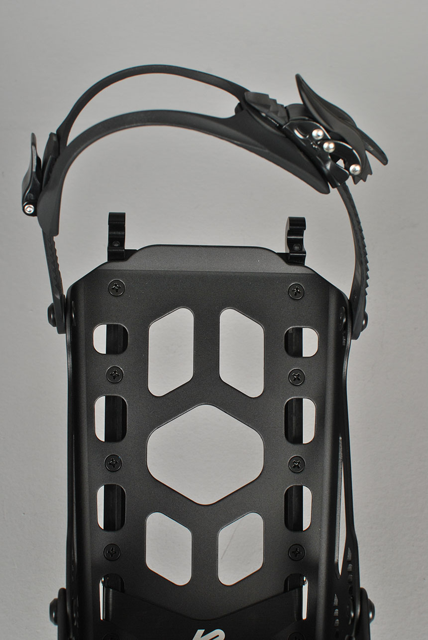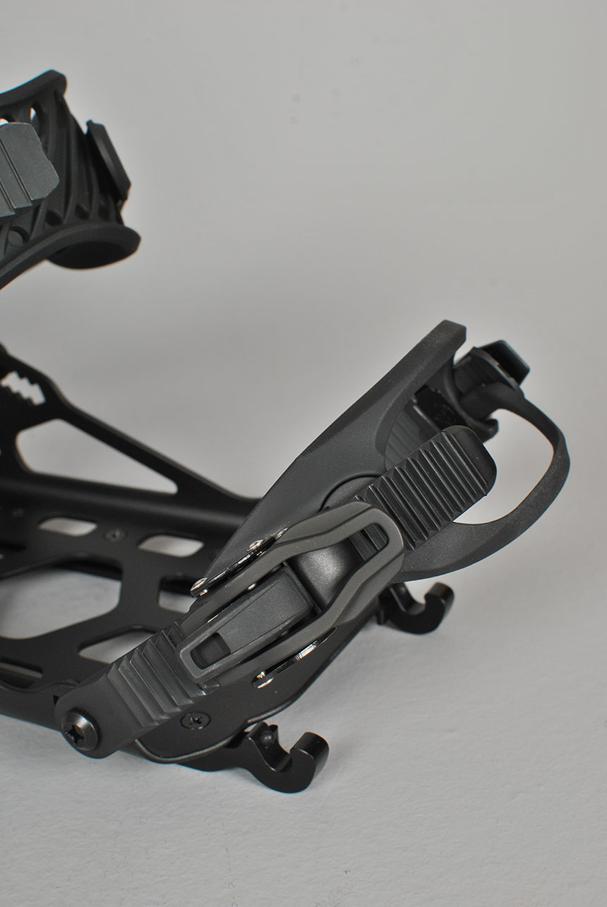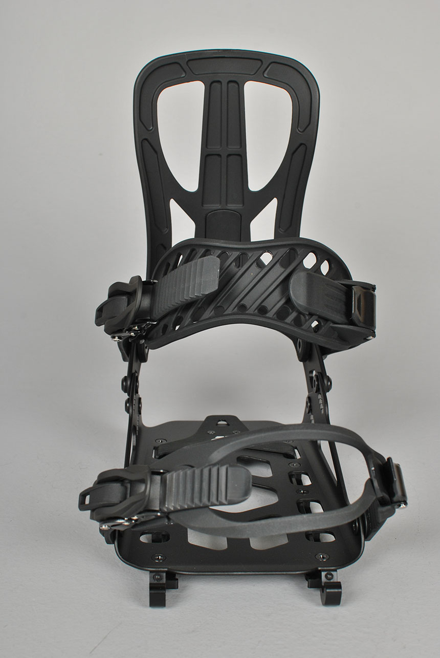Based off a tried and true splitboard baseplate, this chassis works with a splitboard puck-mount system and features an easy-to-use rail and hook system for the interchange between walk and ride modes.
