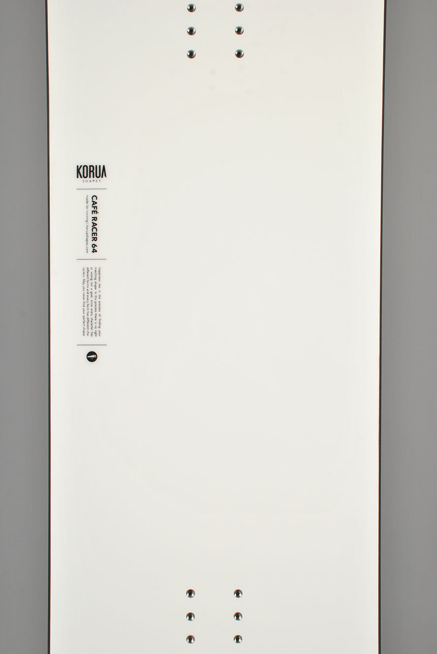 The Café Racer features a FULL CAMBER profile, which provides extra stability and maximum grip, as the full length of your edge lies in the snow, while still providing float and speed in soft snow due to a smooth transition into the nose area. We recommend riding this board with steeper positive binding angles and a slightly narrower stance to let the board flex more naturally under your feet.