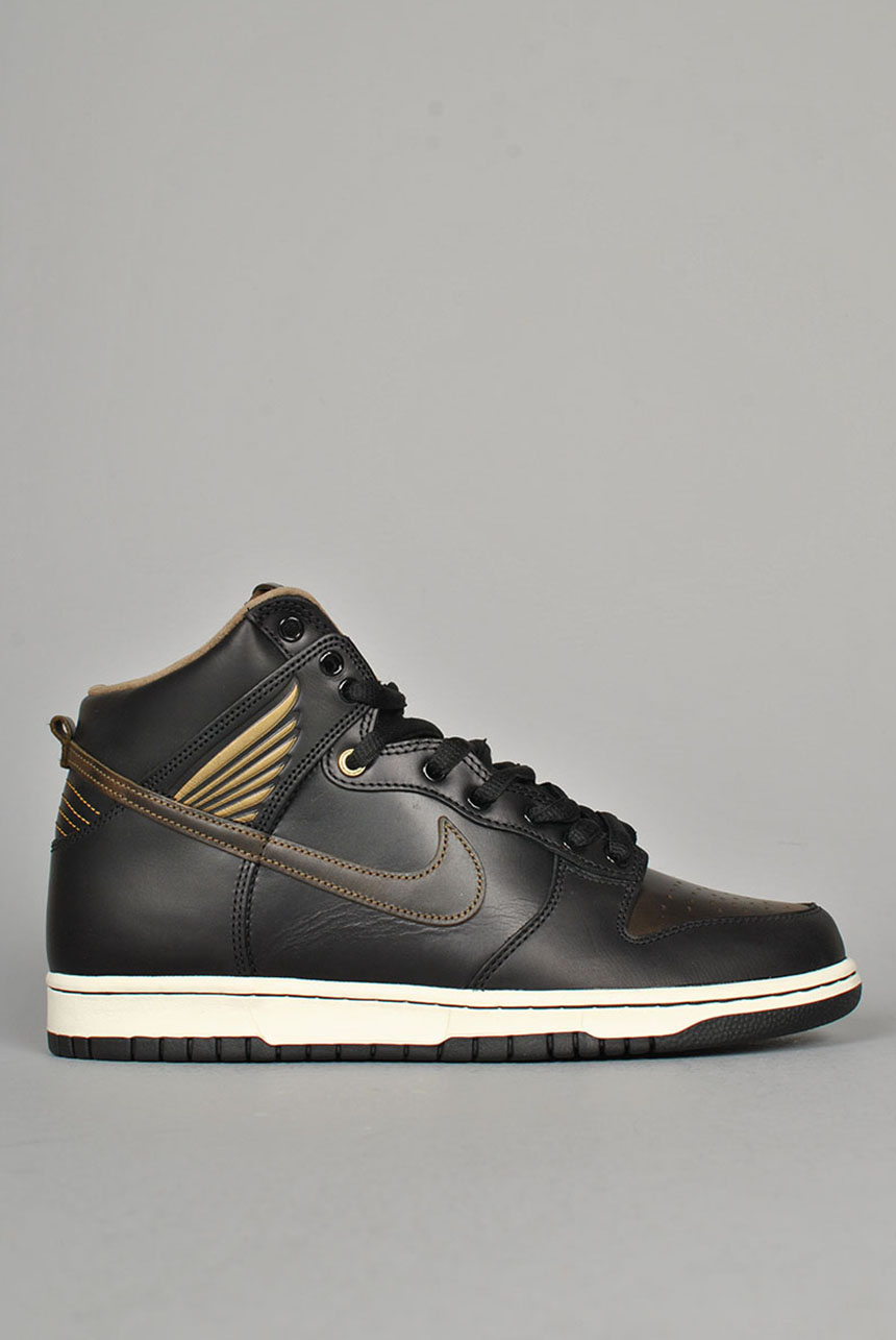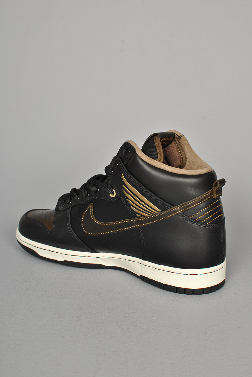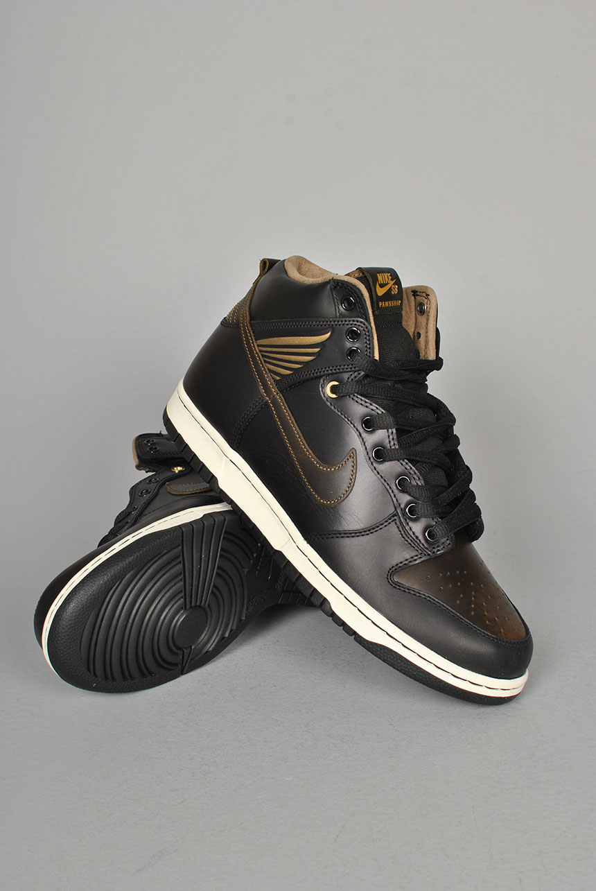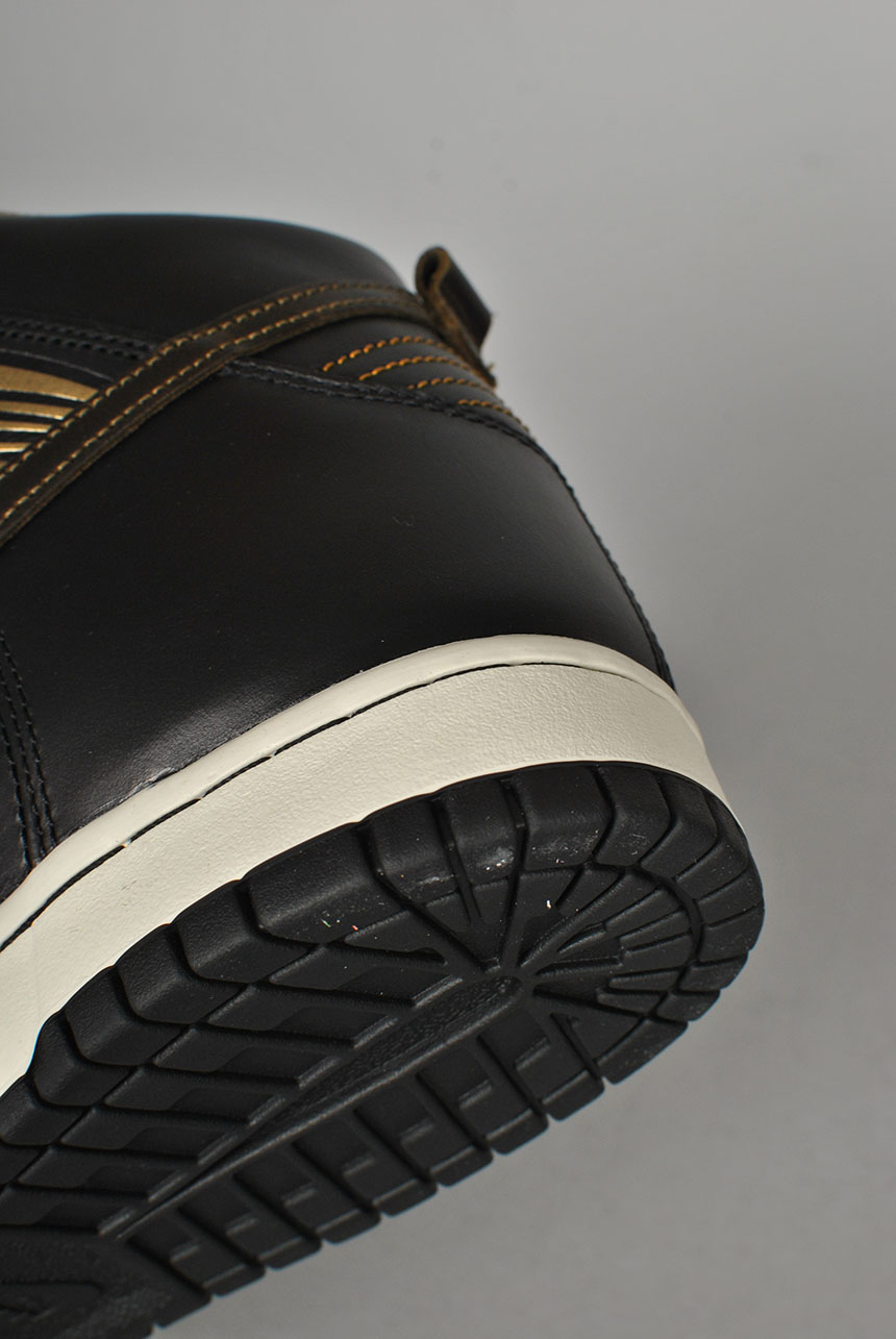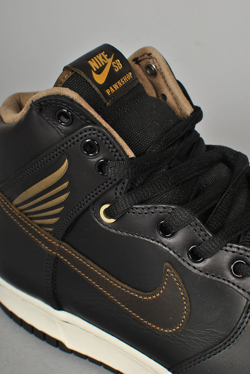 Pawnshop Skate Co. was established in Covina, California in 2010 by Nike SB team rider Donovon Piscopo‘s father, Anthony. In order to support his son, he pawned a family heirloom, and this served as inspiration for the name. And for this footwear initiative, the west coast retailer reimagined he classic SB Dunk High with work boot-inspired details. Designed with the OG Dunk’s tooling, the kicks are readied with a premium black leather upper and come stylized with exposed golden stitchings around the Swooshes along with gilded wings that reside on the collars.