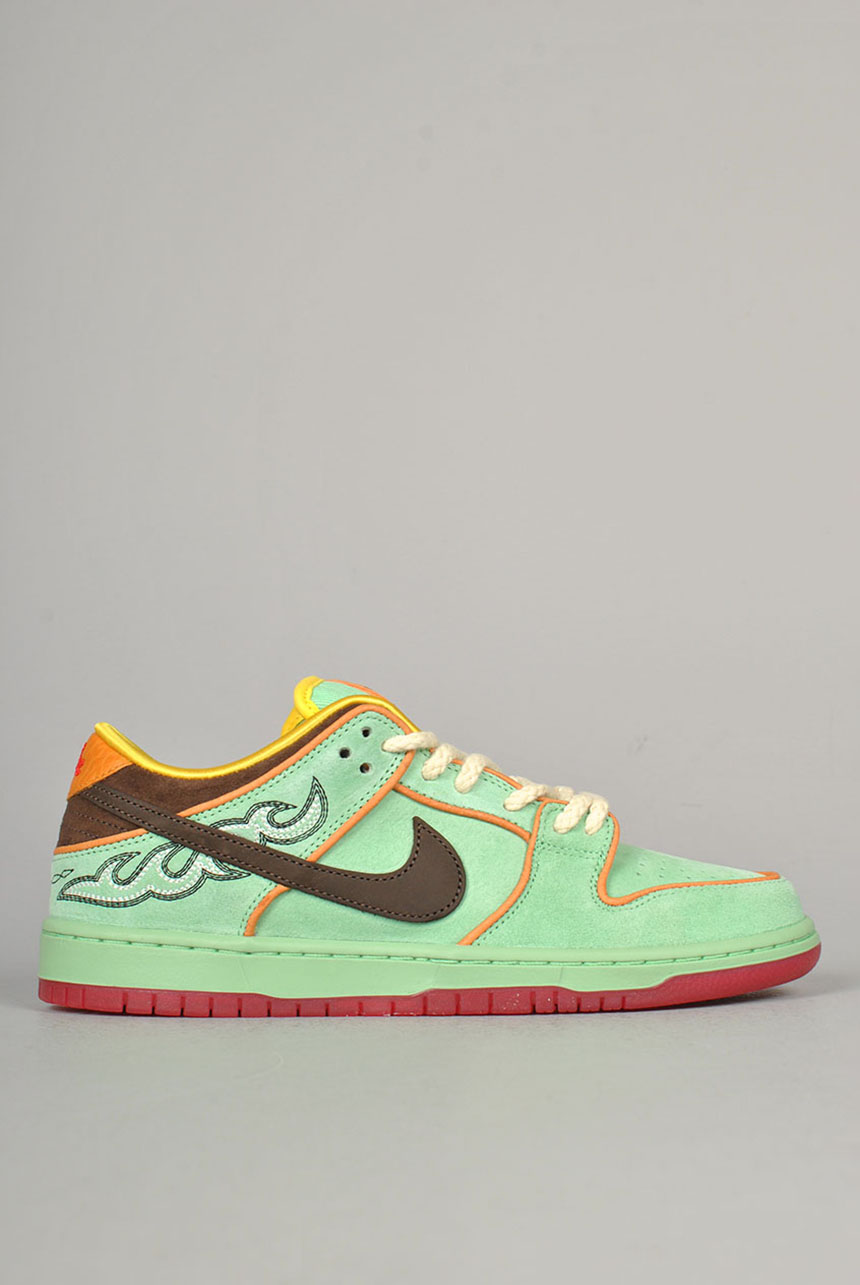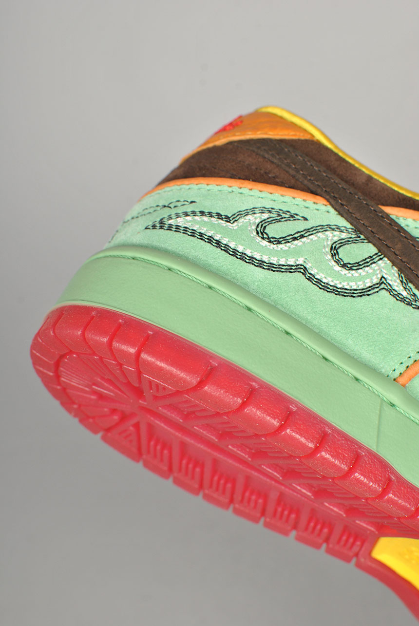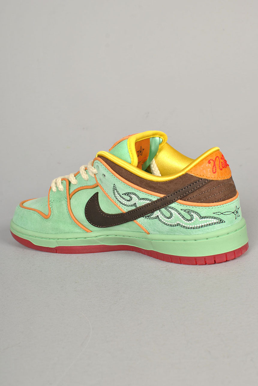 Blazing a turquoise trail, the Dunk "Rodeo" subverts conventions with bold color choices and boot stitch details in a mixed suede and forest leather upper. Accenting the Dunk’s iconic lines with leather piping and chain-stitched branding, dusty earth tones and Old West accents pop with hits of lightning yellow and a red translucent outsole. Riding off into the range, the custom sockliner art depicts a sun-soaked scene of the frontier exploration forged by Black culture and innovation.