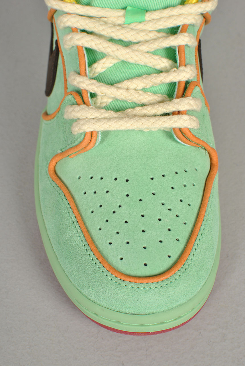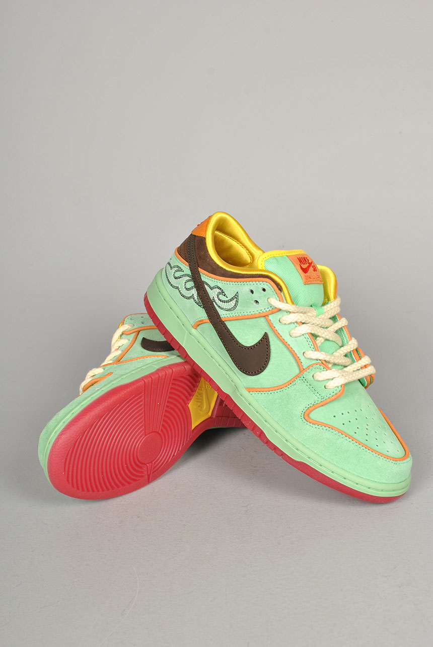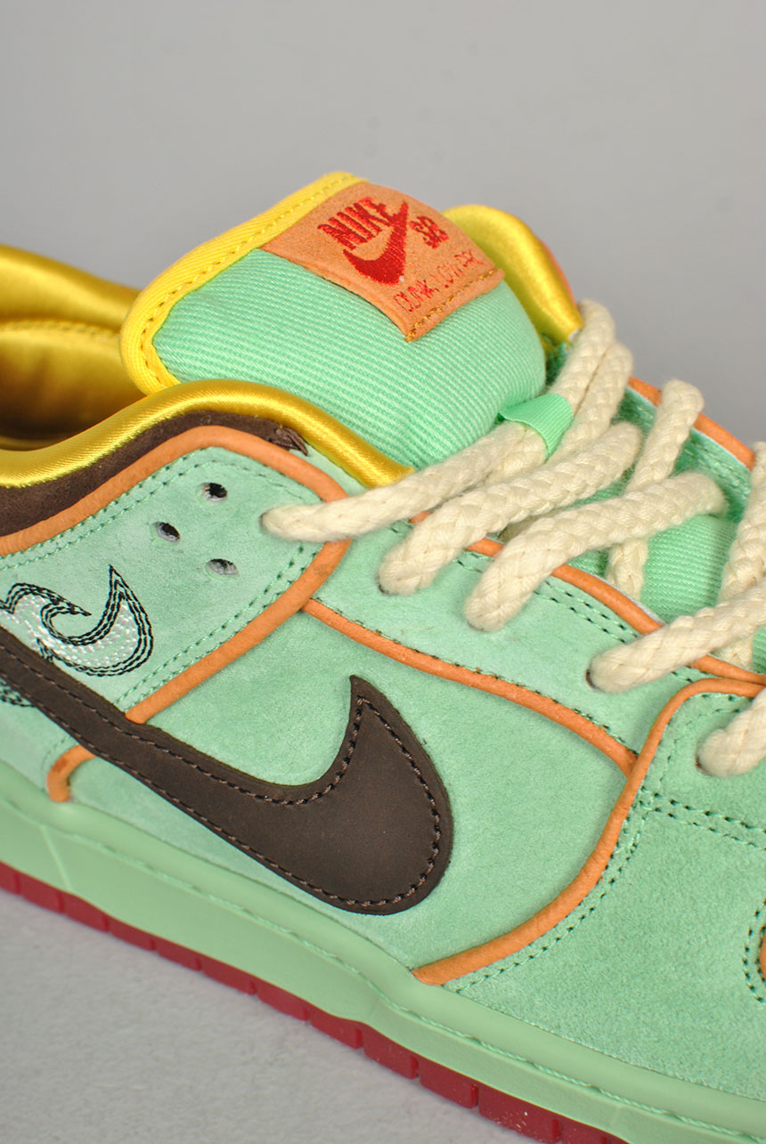 Blazing a turquoise trail, the Dunk "Rodeo" subverts conventions with bold color choices and boot stitch details in a mixed suede and forest leather upper. Accenting the Dunk’s iconic lines with leather piping and chain-stitched branding, dusty earth tones and Old West accents pop with hits of lightning yellow and a red translucent outsole. Riding off into the range, the custom sockliner art depicts a sun-soaked scene of the frontier exploration forged by Black culture and innovation.