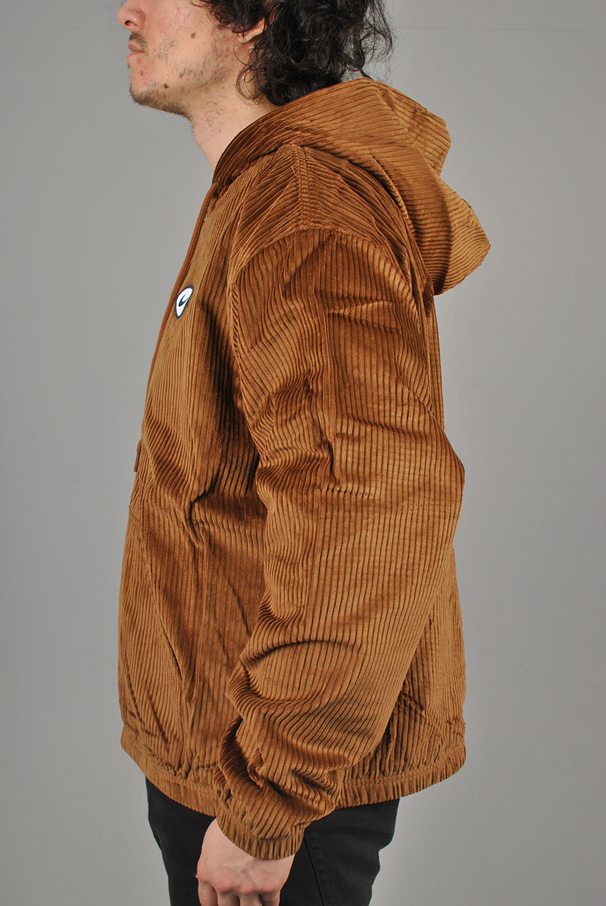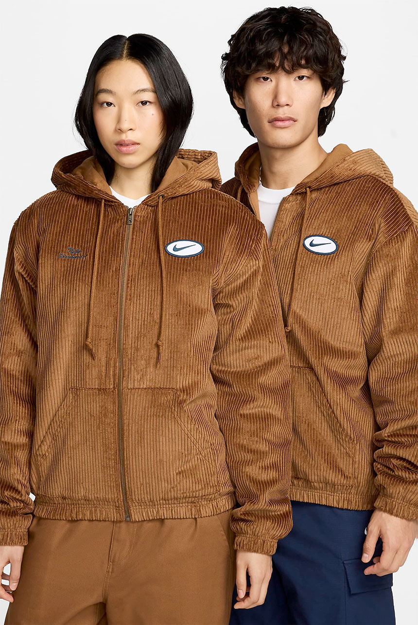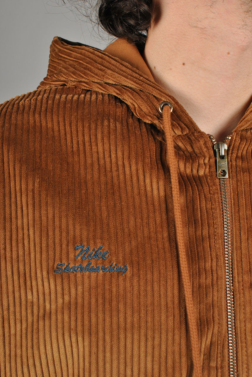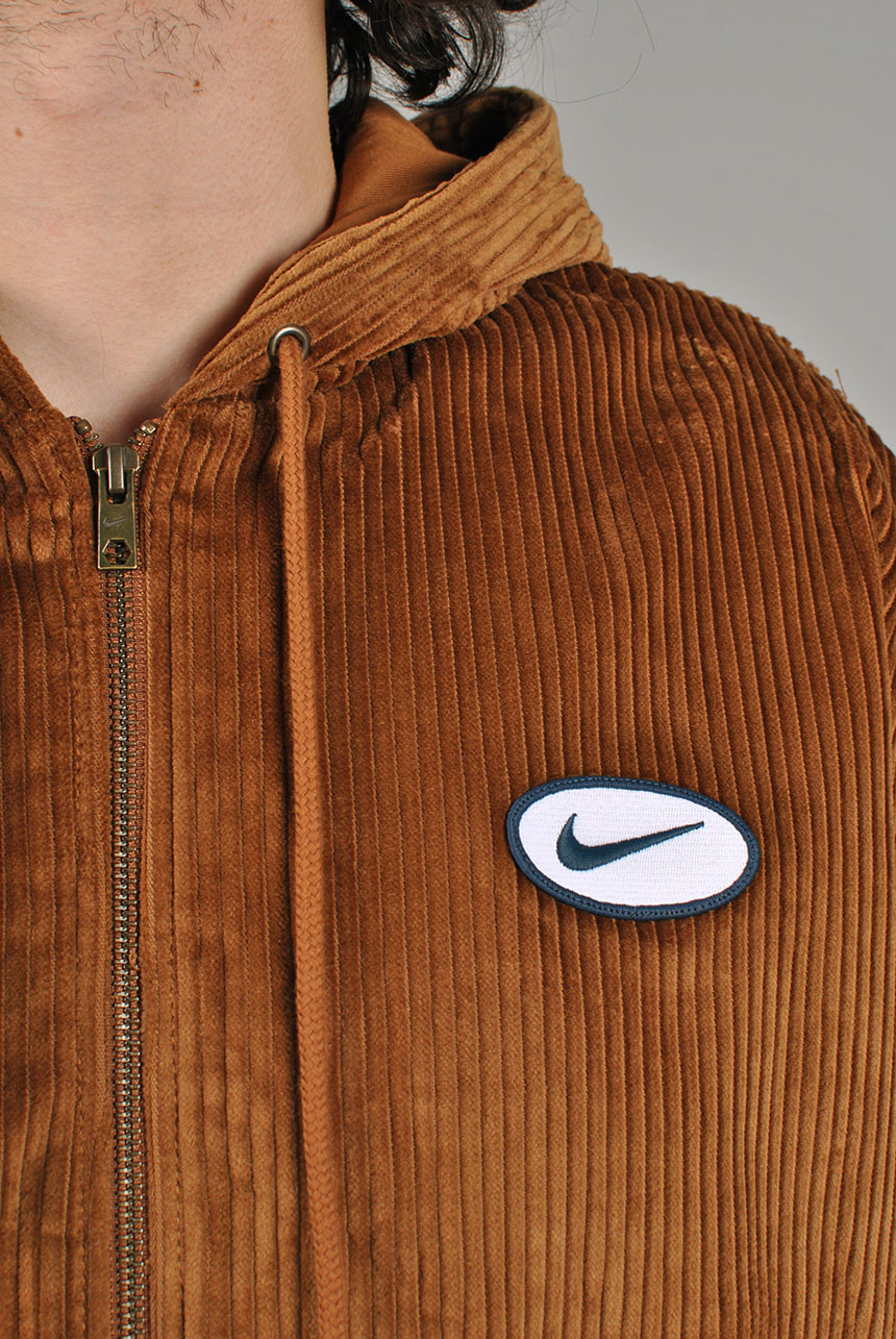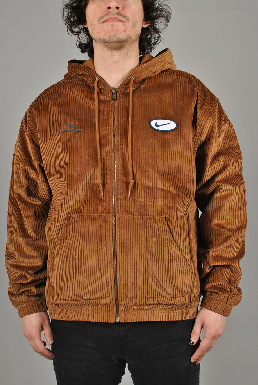 Nike SB Hooded Cord Jacket in Light British Tan and Armory Navy. Loose fitting with a fully lined inner, this Nike SB jacket is made from 100% cotton corduroy. Featuring an adjustable drawstring hood, a full length zipper fastening and elasticated cuffs, this brown Nike SB jacket is finished with an elasticated hem two front pockets, an embroidered patch graphic and with embroidered logo branding.