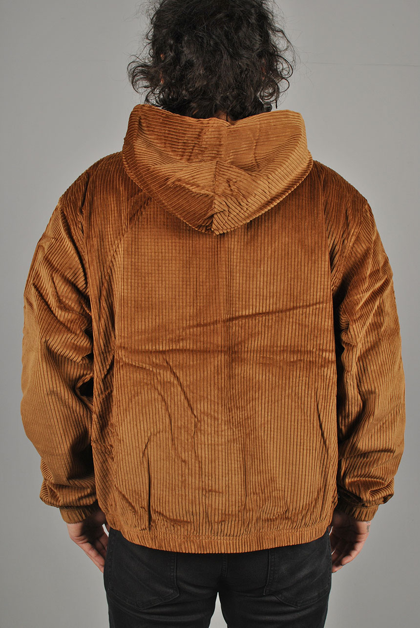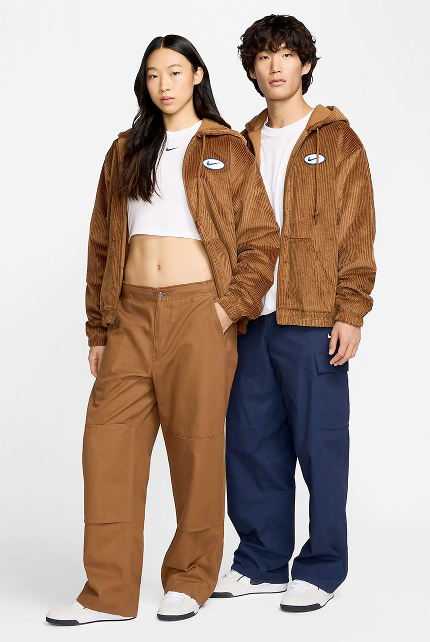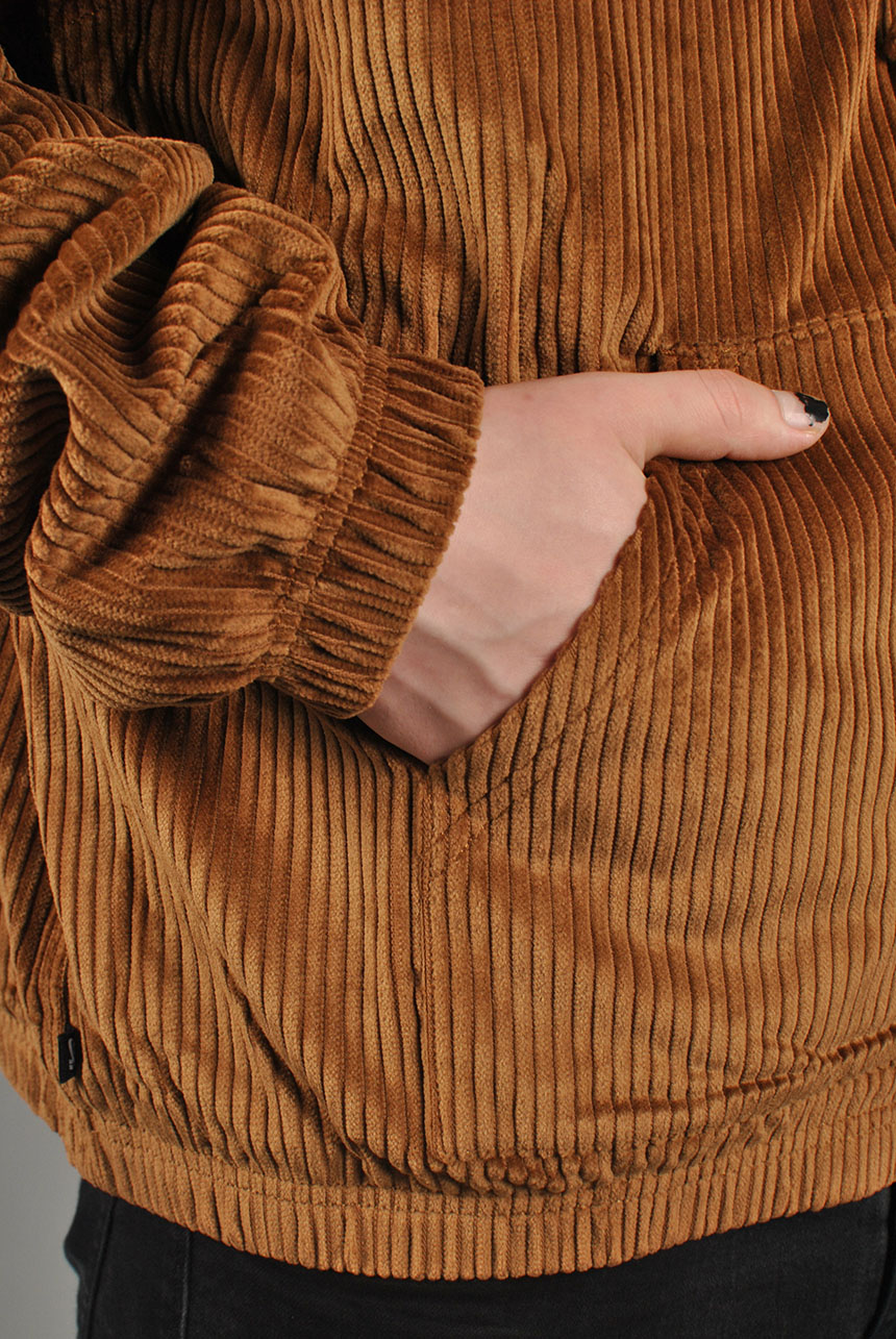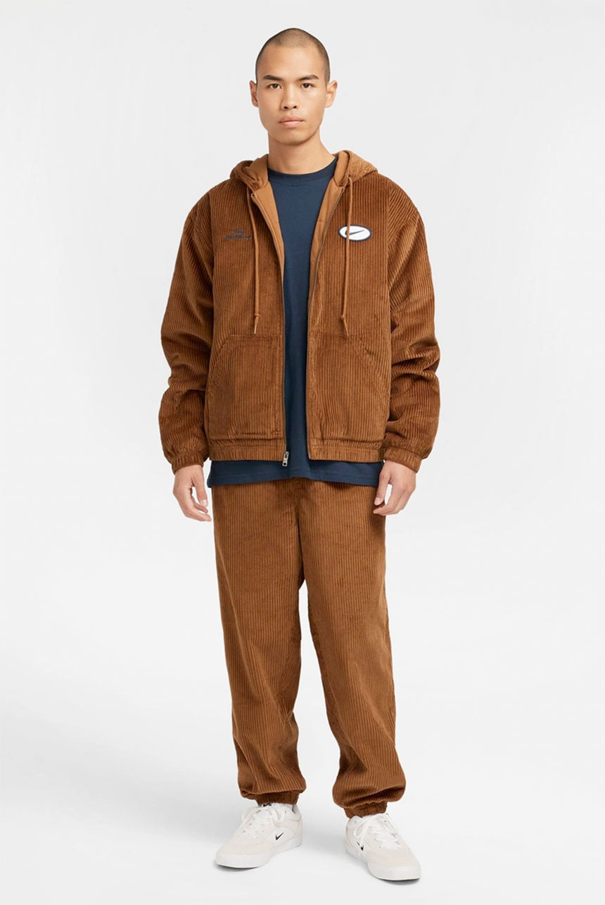 Nike SB Hooded Cord Jacket in Light British Tan and Armory Navy. Loose fitting with a fully lined inner, this Nike SB jacket is made from 100% cotton corduroy. Featuring an adjustable drawstring hood, a full length zipper fastening and elasticated cuffs, this brown Nike SB jacket is finished with an elasticated hem two front pockets, an embroidered patch graphic and with embroidered logo branding.