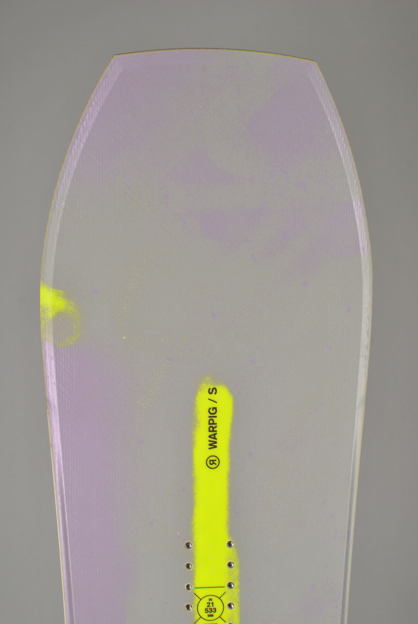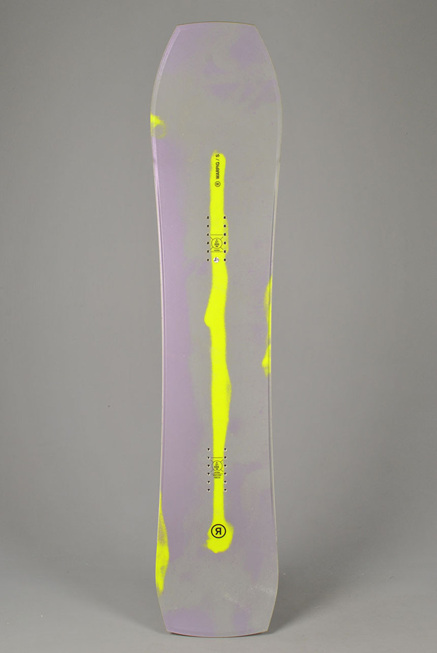 A twin sidecut which allows for the underfoot width of a wide board in the tip/tail width of a standard size. This design provides improved leverage on landings, grip through turns, and stability on flat base.