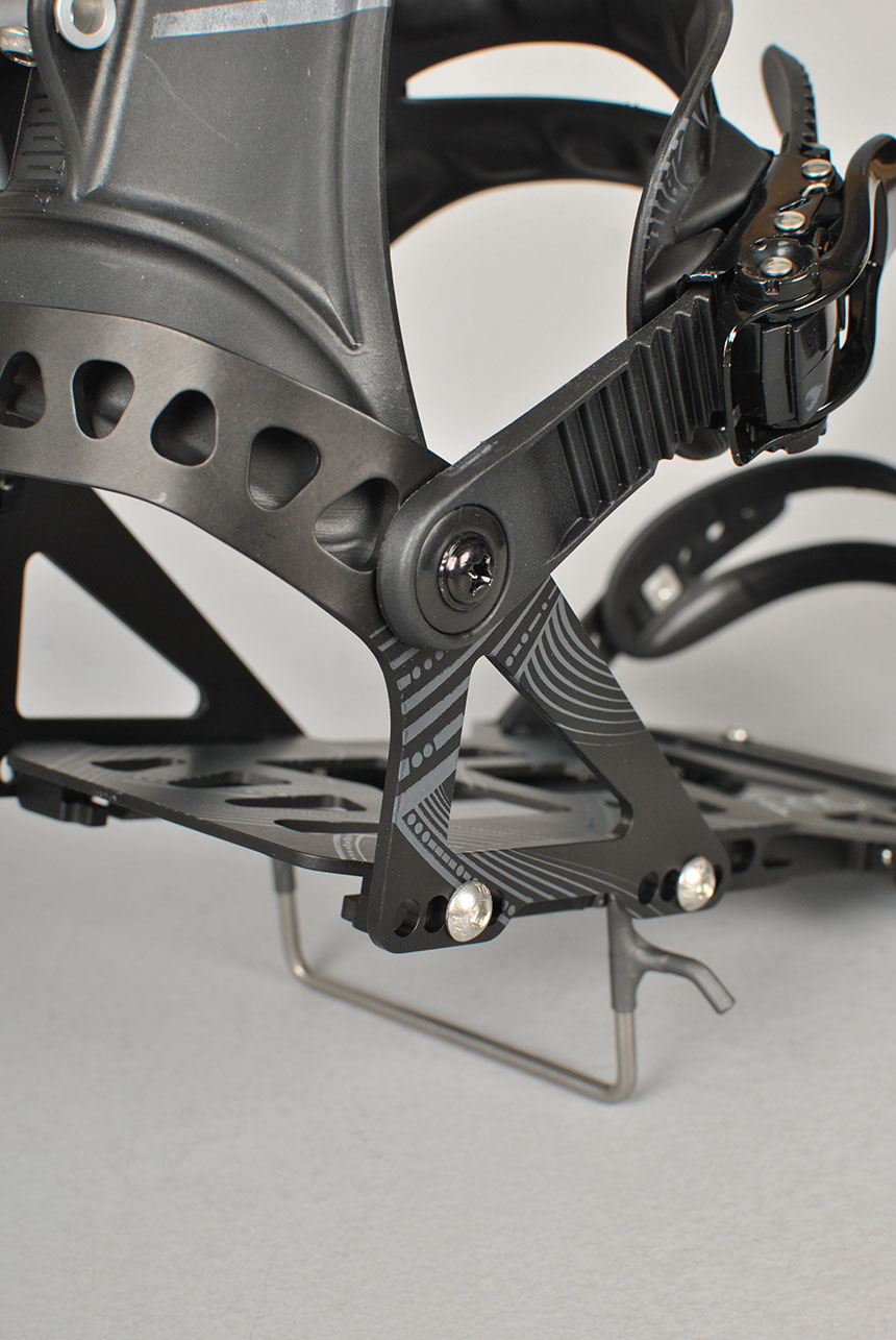 A single fatty climbing wire is built into the baseplate with a side arm lever for easy position changes on the steeps. You can switch easily from stowed, to low (12°), to high (18°) and back again while touring.