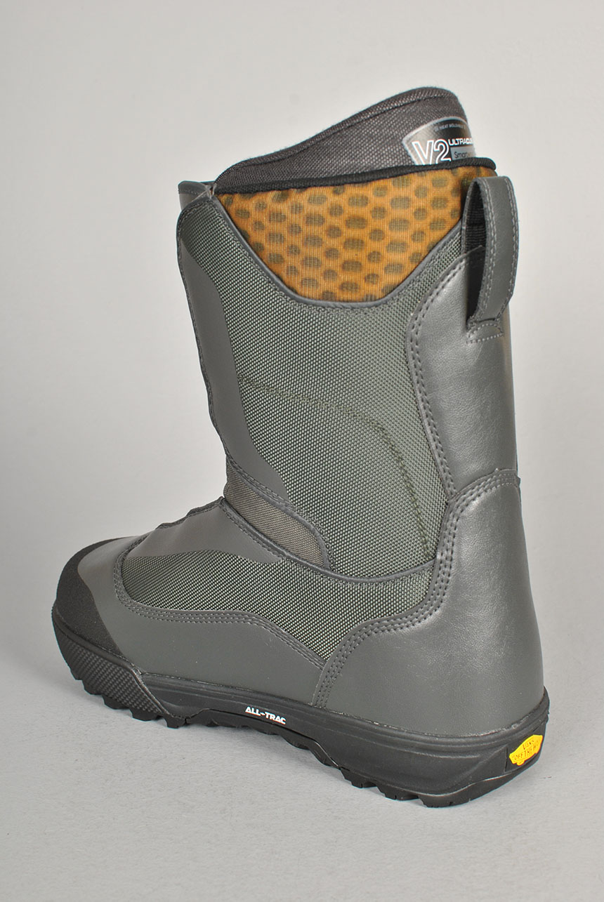 • V2 WAFFLE PRO™ OUTSOLE WITH ALL-TRAC COLD WEATHER RUBBER COMPOUND – The V2 Waffle Pro™ is built for both on- and off-snowboard performance. Uncompromising natural flex and a weight-reducing, impact-resisting UltraCush™ midsole provide incredible boardfeel, while a Vans-exclusive lug tread pattern and rubber compound give you the grip and traction you need to scramble the side country with confidence.